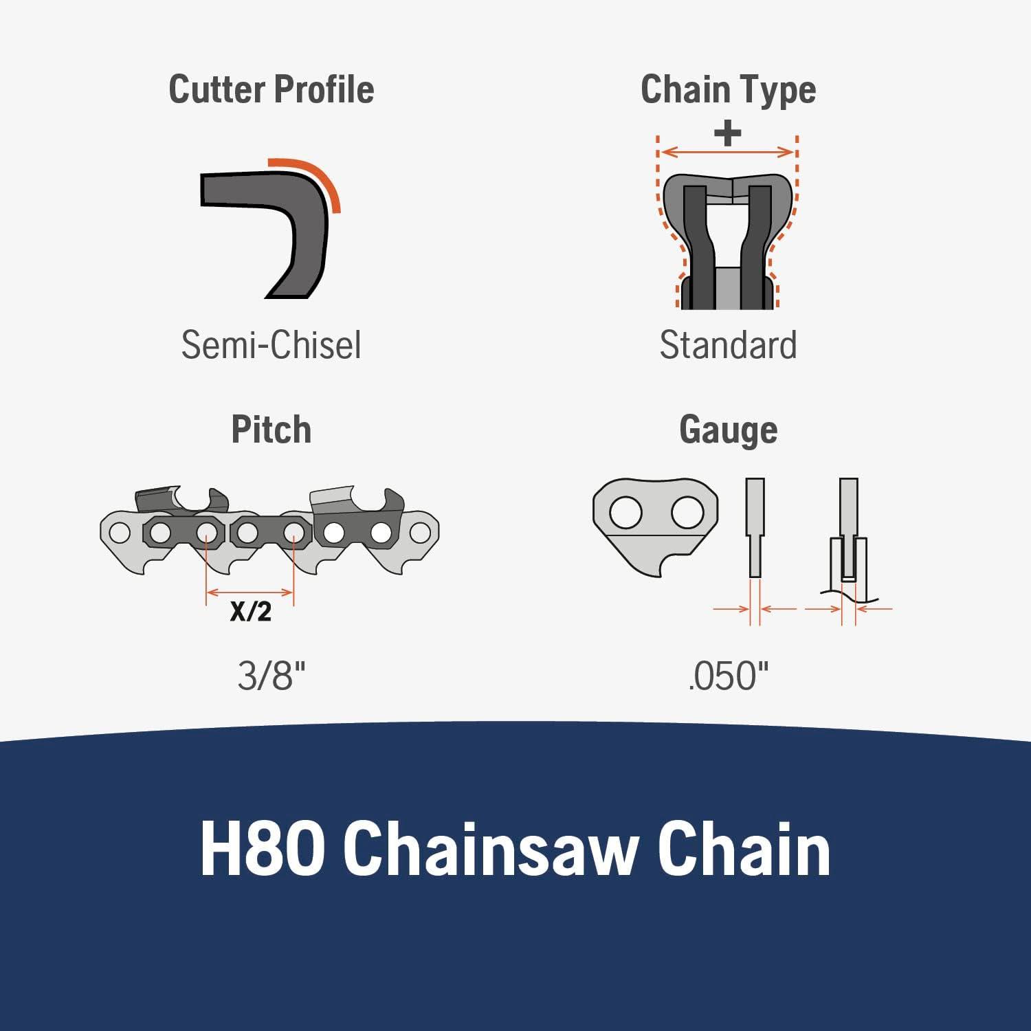 Give your chainsaw excellent precision and unparalleled performance with the Husqvarna Rancher X H80 20 Inch Chainsaw Chain. This chainsaw chain is compatible with select 20 inch chainsaw models: Husqvarna 455 Rancher and 460 Rancher. It also fits the following other models: 55 Rancher, 257, 261, 362XP, 359, 460 and 555455. Due to their smooth operation, lasting sharpness and low kickback, these Husqvarna chainsaw chains generate high cutting efficiency while improving maneuverability and reducing strain on the body. These reliable chainsaw accessories are designed to meet the specific needs of today's lightweight chainsaws with a balanced combination of materials and manufacturing processes to generate high durability. In addition, the chainsaw chain 20 inch replacement is pre-stretched at the factory to work longer without needing to be adjusted. Oil-shaped channels in the links transport oil to the chain for superior lubrication and less wear and tear on your Husqvarna chainsaw. With excellent precision and performance in narrow spaces, this 20 inch chainsaw blade is ideal for arborists and for those who use smaller-sized chainsaws in a high-production environment. These Husqvarna replacement parts are also available in 16- and 18-inch lengths to accommodate additional Husqvarna chainsaw models.