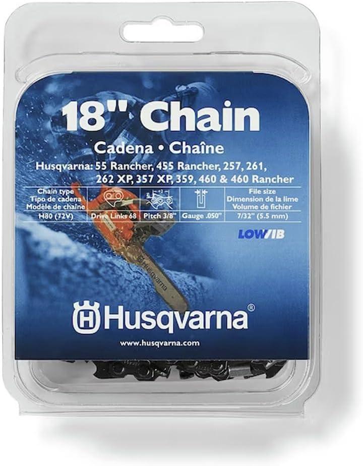 18-Inch Husqvarna chainsaw chain with .050 gauge 3/8 pitch. A low kickback and low-vibration chain that fits with Husqvarna chainsaw models: 55 Rancher, 455 Rancher, 257, 261, 262xp, 357xp, 359, 460, 460 Rancher