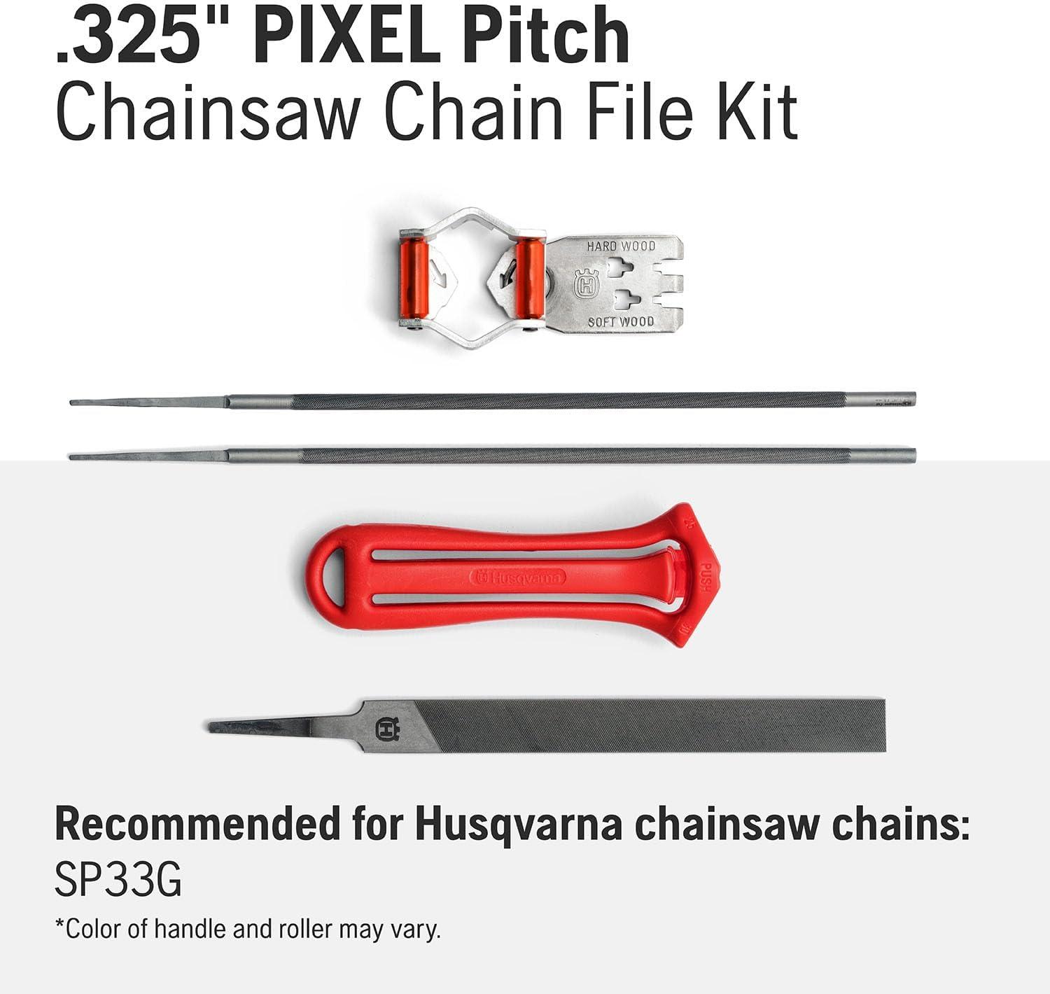 The Husqvarna X-Cut SP33G Chainsaw File Kit includes everything you need to sharpen your chainsaw chain. Each chainsaw sharpening kit includes one (1) file handle, one (1) combination file guide (featuring a 2-in-1 roller file guide and depth gauge), two (2) round files, and one (1) flat file. Use these chainsaw sharpener files for filing .325-inch Pixel chainsaw chains, including the Husqvarna SP33G X-Cut chain. The comfortable file handle ensures control during the sharpening process, while the included file guide and chainsaw depth gauge tool ensures the correct filing angle to simplify the sharpening process. Because keeping your chain well-maintained can help it last longer, this chainsaw filing kit is an essential addition to your chainsaw accessories. In addition to chainsaw blade sharpening kits, Husqvarna offers a variety of other chainsaw accessories, including chainsaw chains, individual chainsaw files and protective gear.